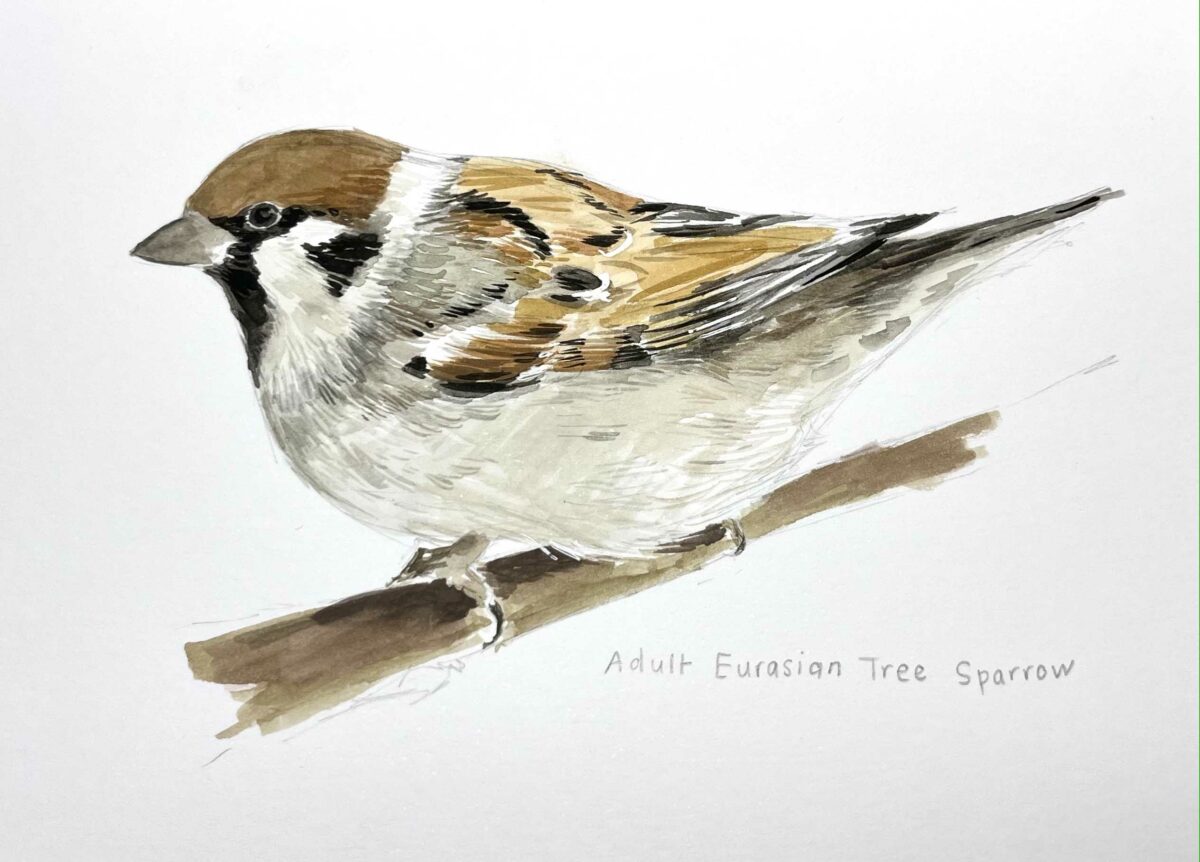 This week I worked in watercolour gouache, focusing on the Eurasian Tree Sparrow, found commonly in Southeast Asia but has been introduced in the USA and Europe. Its habitat is farmland and woodland, as it enjoys a scattered treeline. It reminds me of a brown chickadee, and it is roughly the same size, if not a bit bigger. They favour nesting in buildings, cliff faces, and holes in trees.