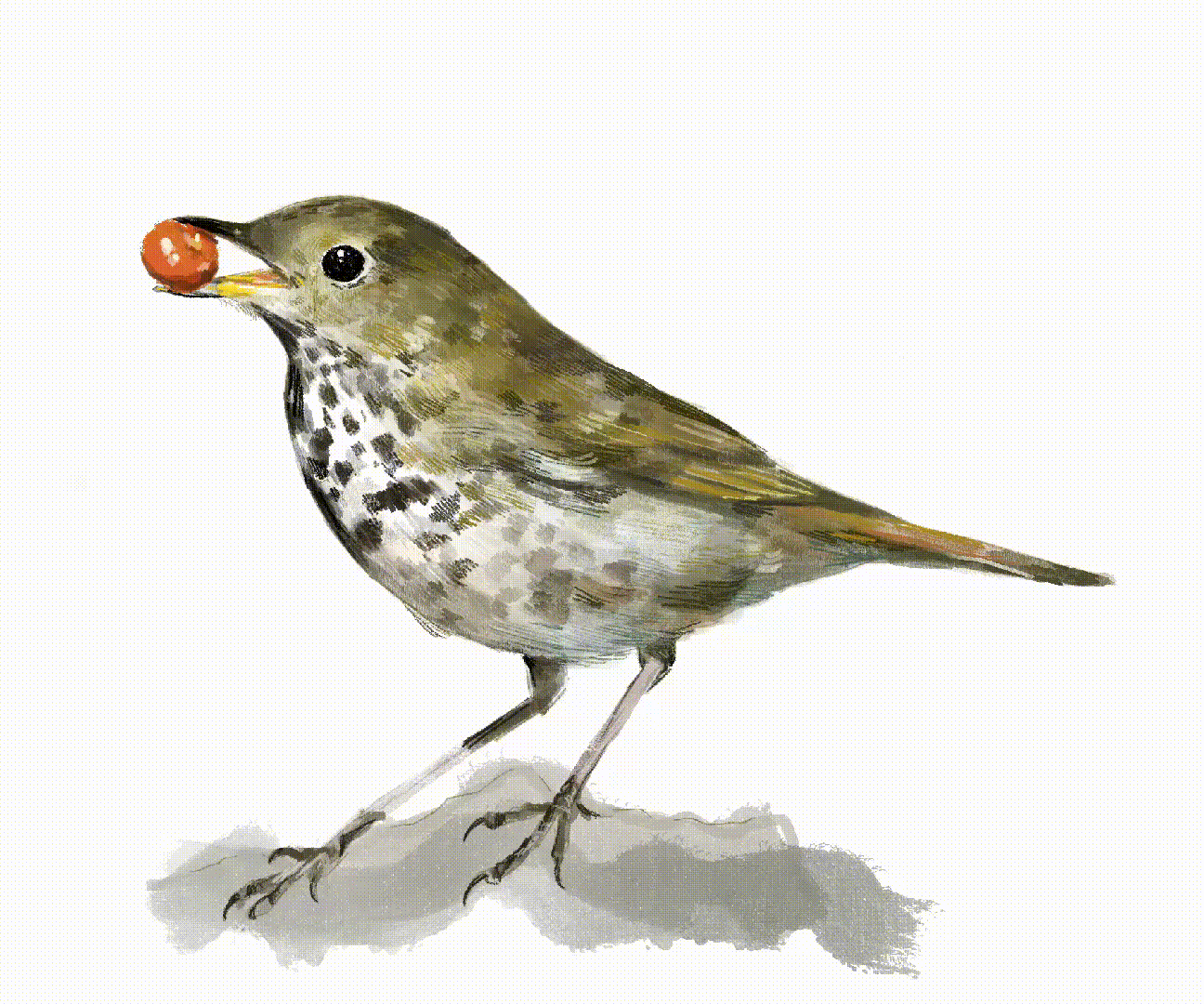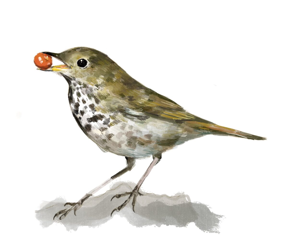 Week three features the Hermit Thrush. It is found all over North America, in Boreal forest and open woodland. What I didn’t know, was that it is a ground dweller, and constructs its nest on the ground. Both the male and female look similar, with dark olive-y brown and spotted underparts.