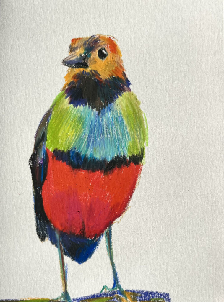 This week I drew a Red-bellied Pitta, a bird found in Asia and some parts of Australia. There are many types of Pitta’s, and most of them have red bellies. They are rarely spotted, and often stick close to the forest floor in dense shrubbery on the hunt for beetles and other insects. They are fairly silent birds, only whistling during mating season. I find they look a bit cheeky.