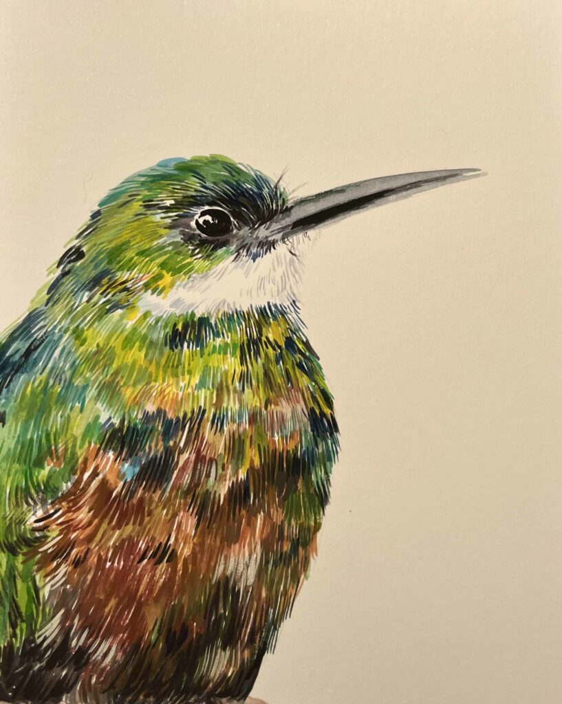 I painted the Rufous-crested Coquette this week, a small and distinct bird found in the Andes mountains in South America, although it is only seen very rarely. It is a quick hunter, catching large insects in flight, and also feasts on nectar. It is a type of hummingbird. I personally love drawing hummingbirds, and I like the more subdued colours of its body compared to some of our local hummingbirds like the Anna’s.