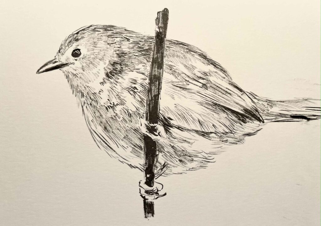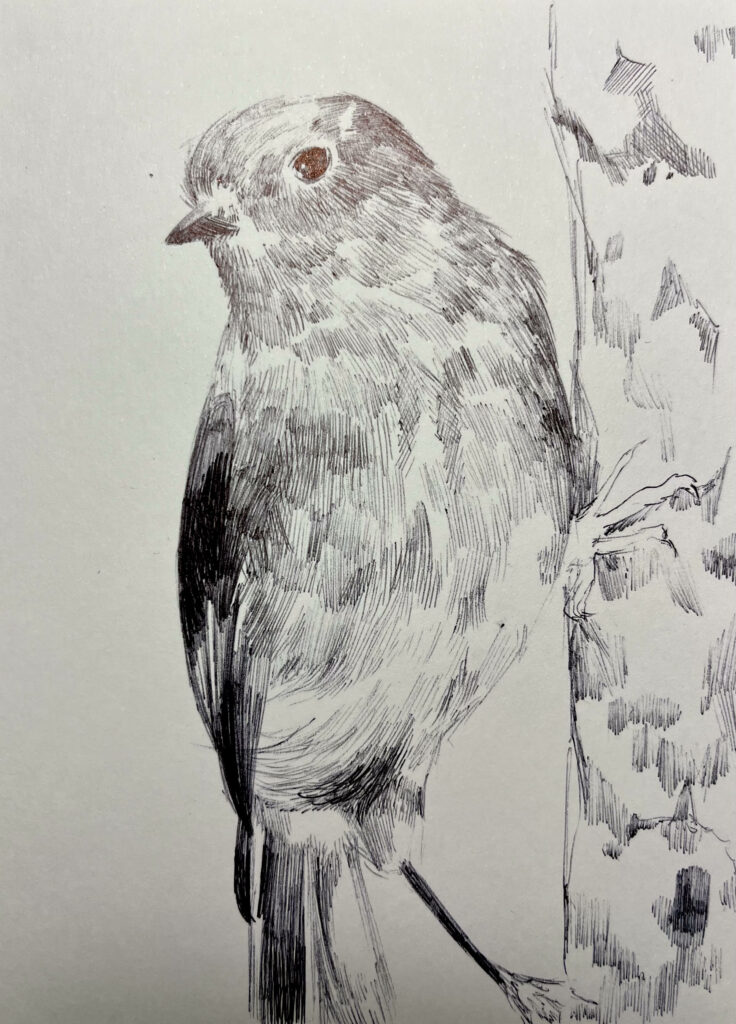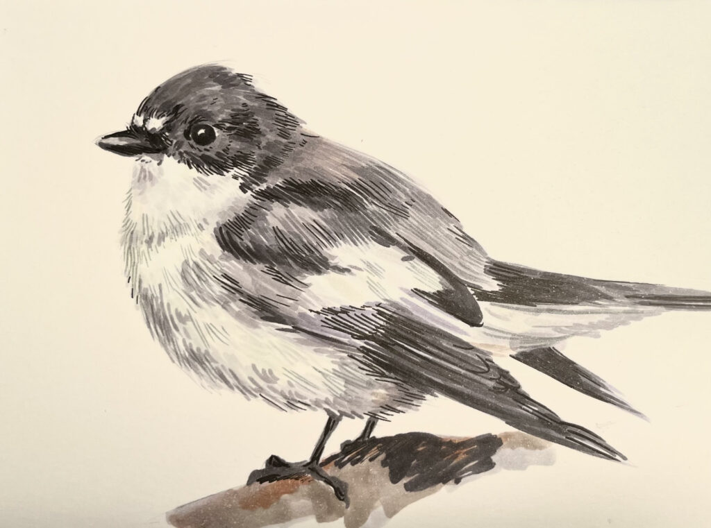 All done, and considering my little studio room is still out of operation, I went for simple this week. I watched a great video for my link-to-practice inquiry about embracing limitations, and how that can get people thinking creatively. I think limiting my drawing really benefits me on occasions, as I can relax a bit and focus on line making over quality of colour, for example. I drew the New Zealand Robin with a ball point pen, inspired by Neva Hosking’s artwork. I have been following her for 8 or so years now, and find her work very inspired by life and so detailed. She often works with ball point pen. The bird eats small bugs found among leaves, and usually is found in the forest. It is also known to distract prey from its young by performing and dancing around.