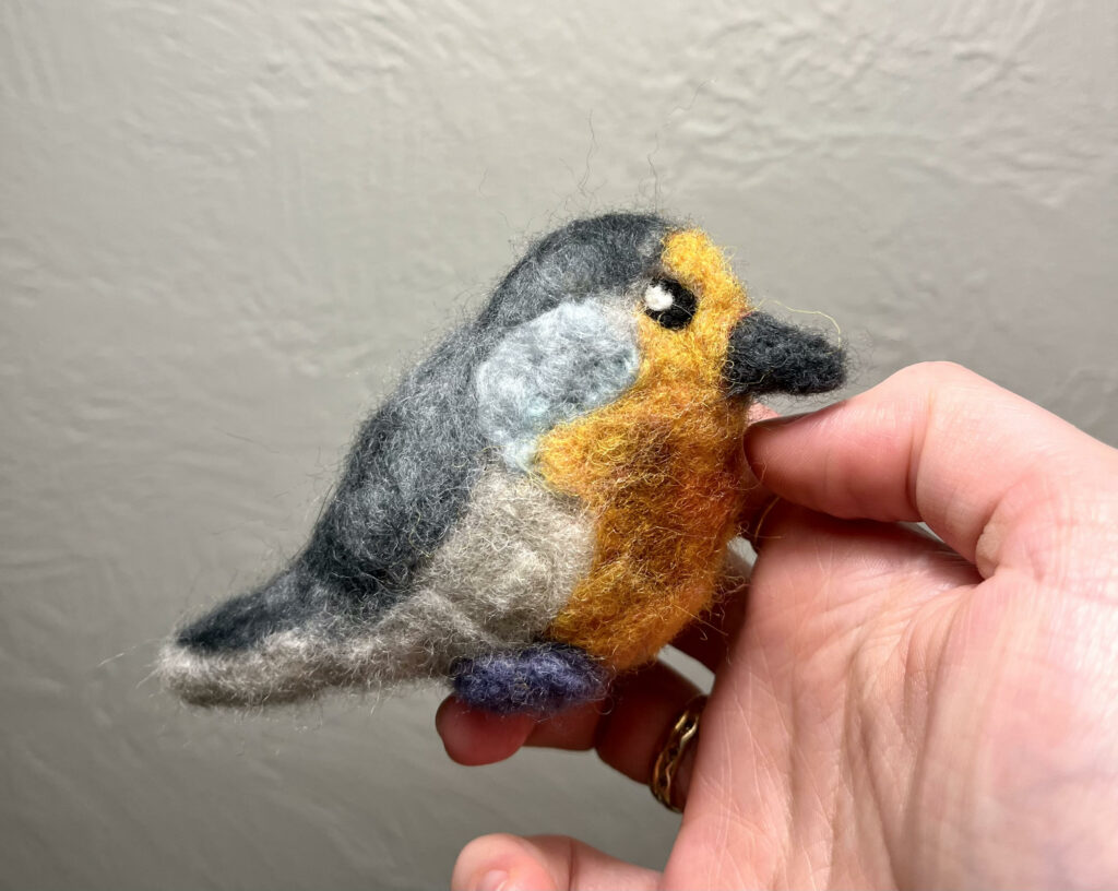 My favourite bird, the European Robin! I decided I couldn’t possibly paint it again, but wanted to represent it somehow. I always get my needle felting out around the holidays for little ornaments as it feels like a cozy thing to work on. I had all the colours I needed to work on it, and it always takes less time than I think I need. Both male and females have similar colouring, featuring the bold orangey throat and belly. While they look very sweet, they can be very aggressive and territorial. They live predominantly in gardens, eating mainly insects. They are also very skilled at hiding nests, especially when nesting around humans.